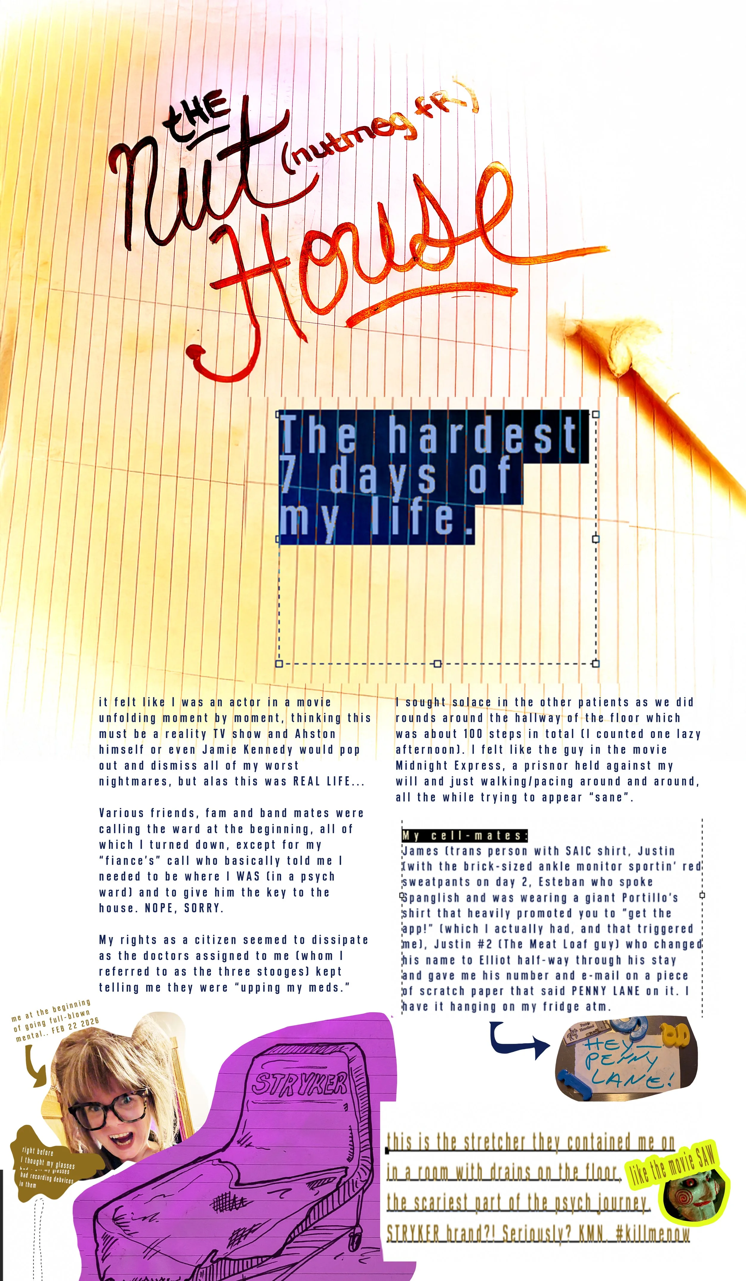 The car slid across all 3 lanes of the highway backwards and landed into a snowy ditch. We thanked God and cheered and hugged and were so shaken up and surprised that we were unscathed and alive. I lit another cigarette in distress as we sat there contemplating what had just happened. Minutes later a patrol car was on the scene and upon further inspection the officer pointed out that my car had a fuel leak. To think we had survived and then a discarded cigarette could have lead to an explosion was very unsettling. The officer wrote me a ticket for “driving too fast for road conditions” which was total bullshit. The car was completely un-driveable and we were stranded on the side of the highway somewhere near Kalamazoo.